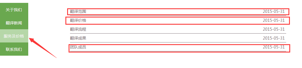 左侧绿色的导航栏目可以去除掉,首页红框标识的地方版块修改为翻译范围把你内页的翻译范围调取出来放到这个版块,一定是要文字的格式而不是图片